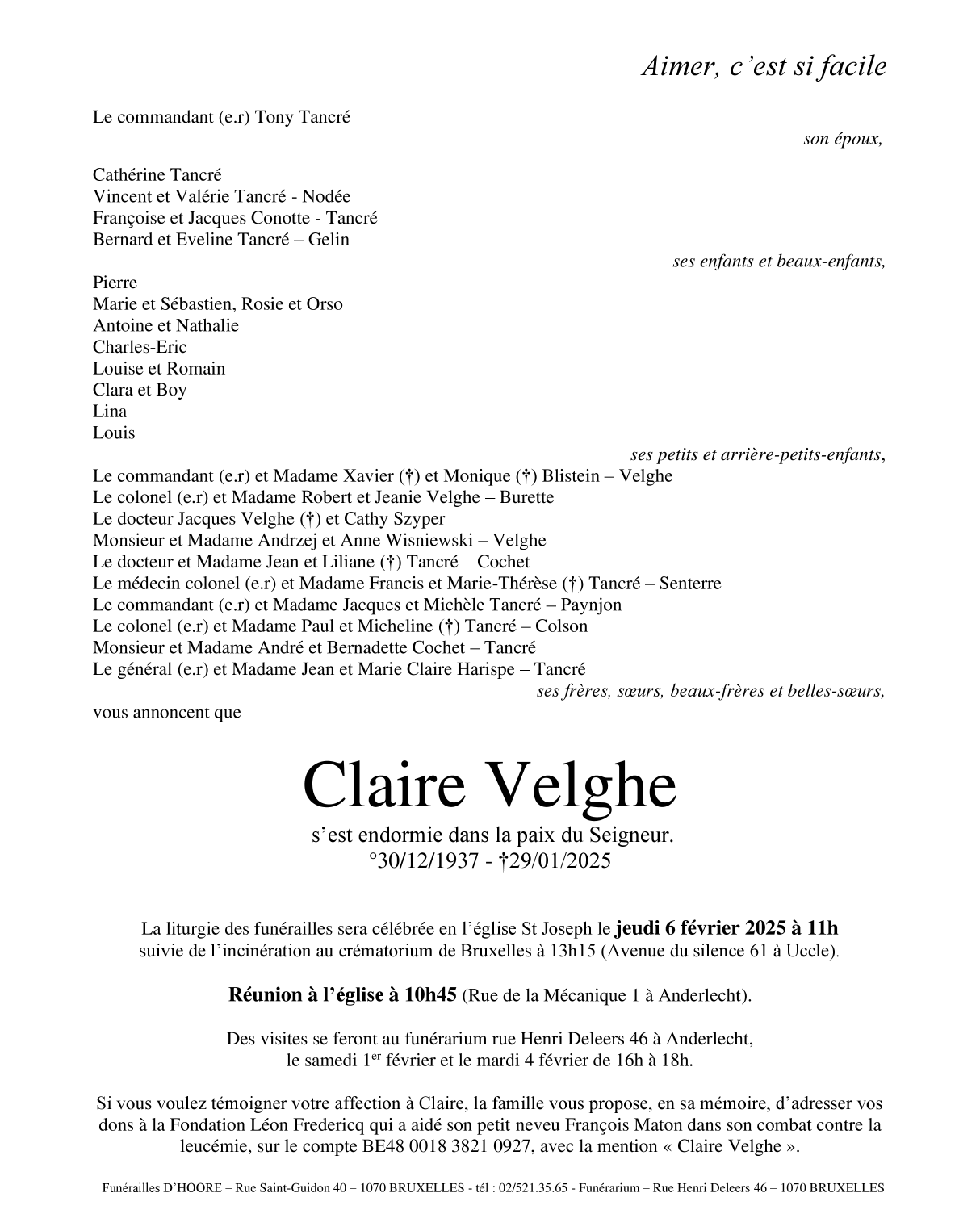Décédée à Bruxelles (Anderlecht) (1070) le mercredi 29 janvier 2025 à l'âge de 87 ans