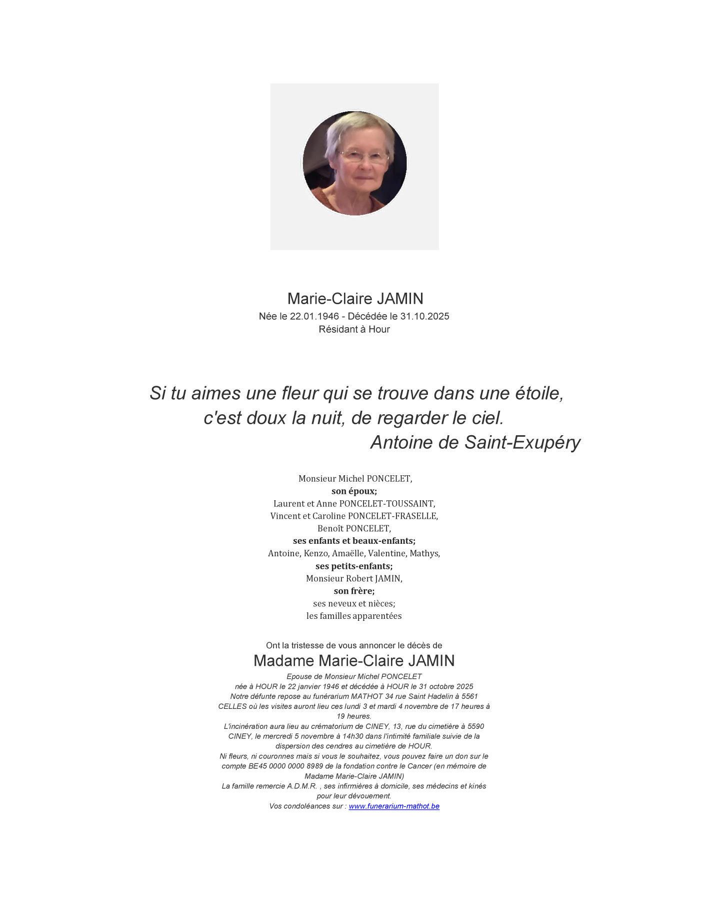 Décédée à Hour (5563) le vendredi 31 octobre 2025 à l'âge de 79 ans