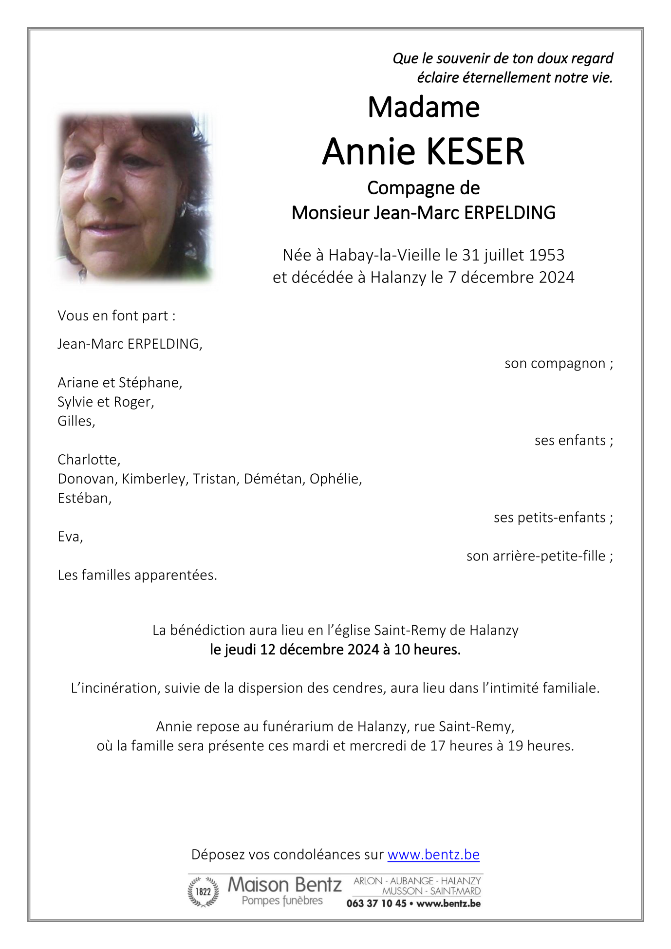 Décédée à Halanzy (6792) le samedi 7 décembre 2024 à l'âge de 71 ans
