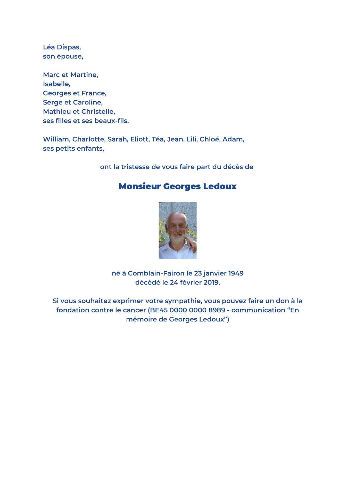 Décédé à Sart-Tilman (4031) le dimanche 24 février 2019 à l'âge de 70 ans