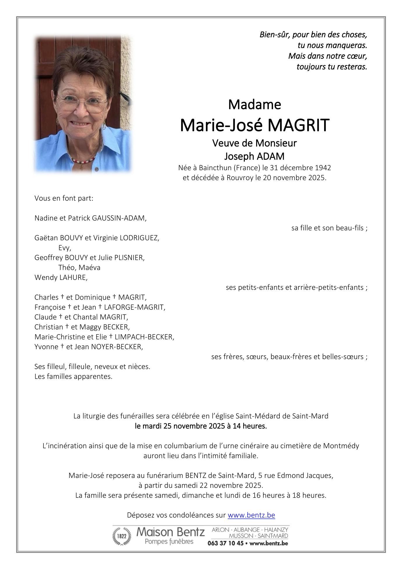 Décédée à Rouvroy (6767) le jeudi 20 novembre 2025 à l'âge de 82 ans