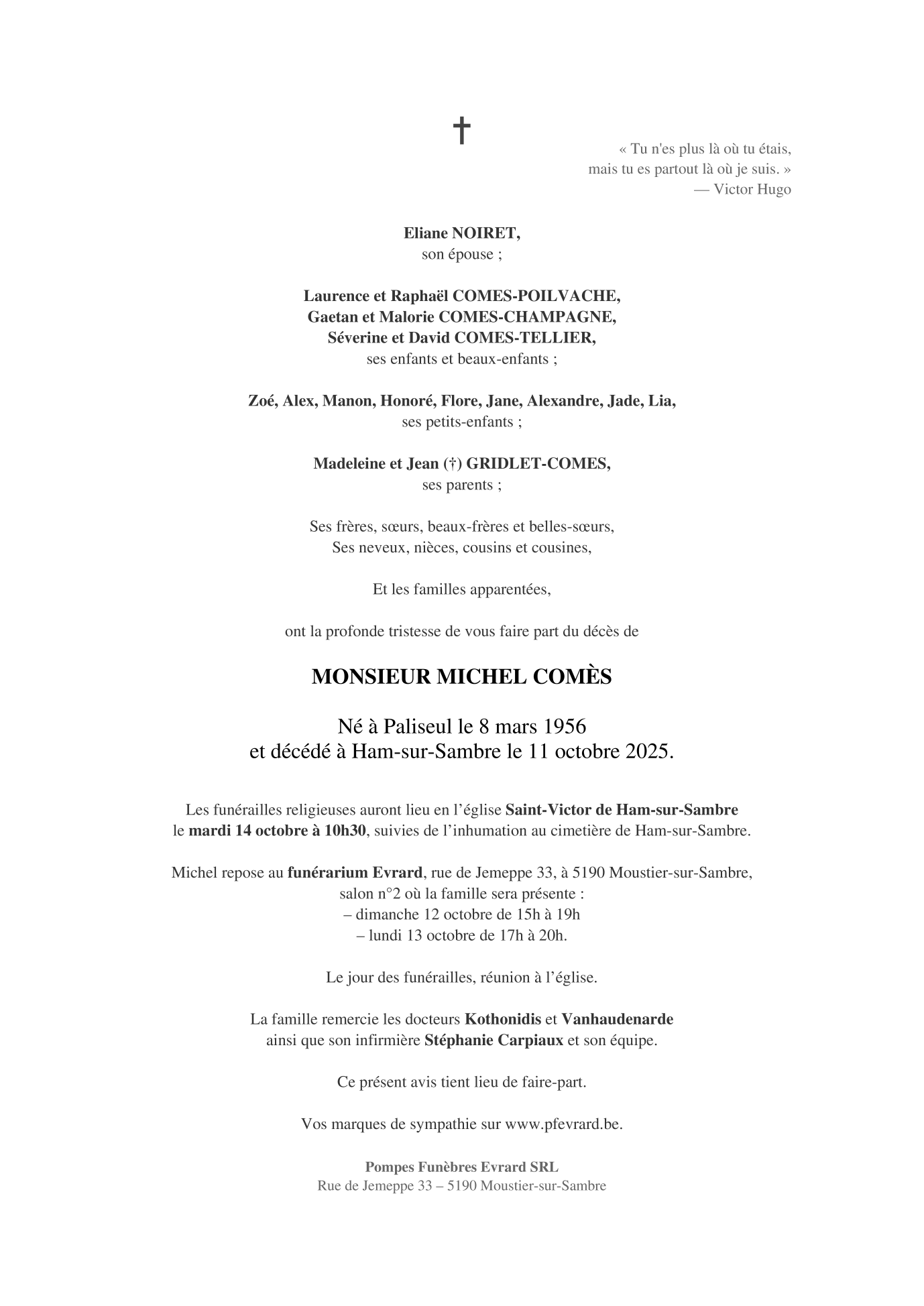 Décédé à Ham-sur-Sambre (5190) le samedi 11 octobre 2025 à l'âge de 69 ans