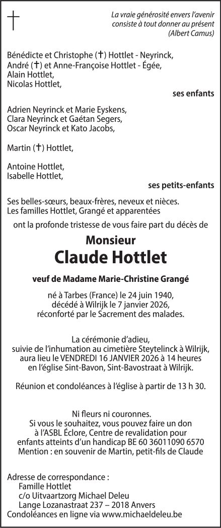 Décédé à Wilrijk (Antwerpen) (2610) le mercredi 7 janvier 2026 à l'âge de 85 ans